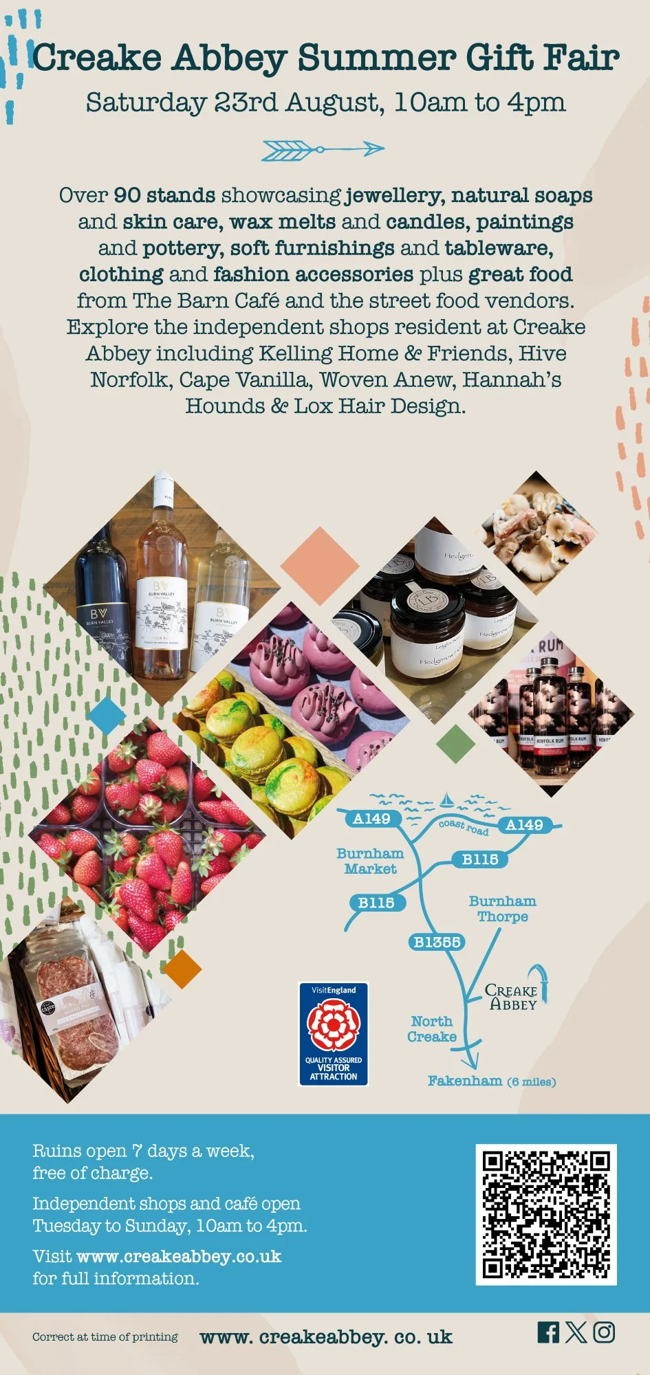 Creake Abbey’s Summer Gift Fair will take place on Saturday 23rd August between 10am and 4pm. This fair is now fully booked but if you are new to Creake Abbey and would like register interest in attending a future event, please email a description of what you sell and a couple of images to info@creakeabbey.co.uk.